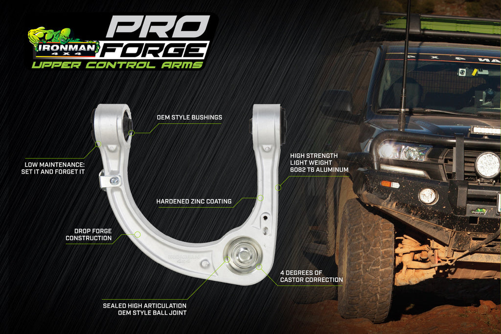 Specification & Dimension:Feature Specification Brand Futurz 4x4 Manufacturer Ironman 4x4 Material 6082 T6 forged alloy Caster Correction #ERROR! Construction Drop-forged, anodised for corrosion protection Ball Joint Type High-strength chromoly, sealed design Bushings Heavy-duty, high-flex rubber Brake/Sensor Provisions Integrated mounts for brake lines and sensor wires Fitment Direct replacement for OEM upper control arms Application Optimized for lifted vehicles, improves alignment geometry Warranty 3 years or 60,000 km